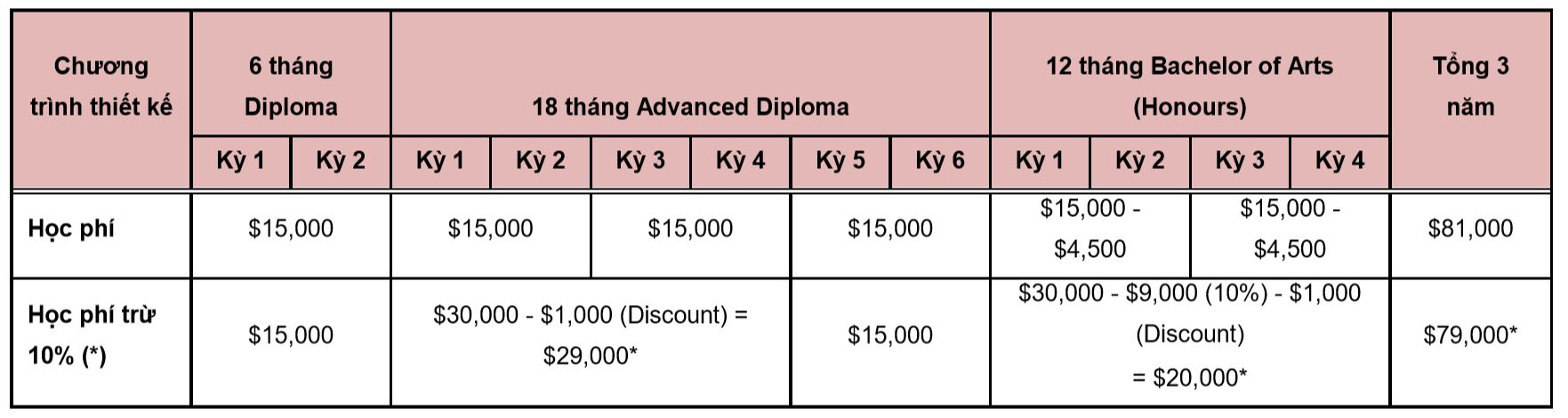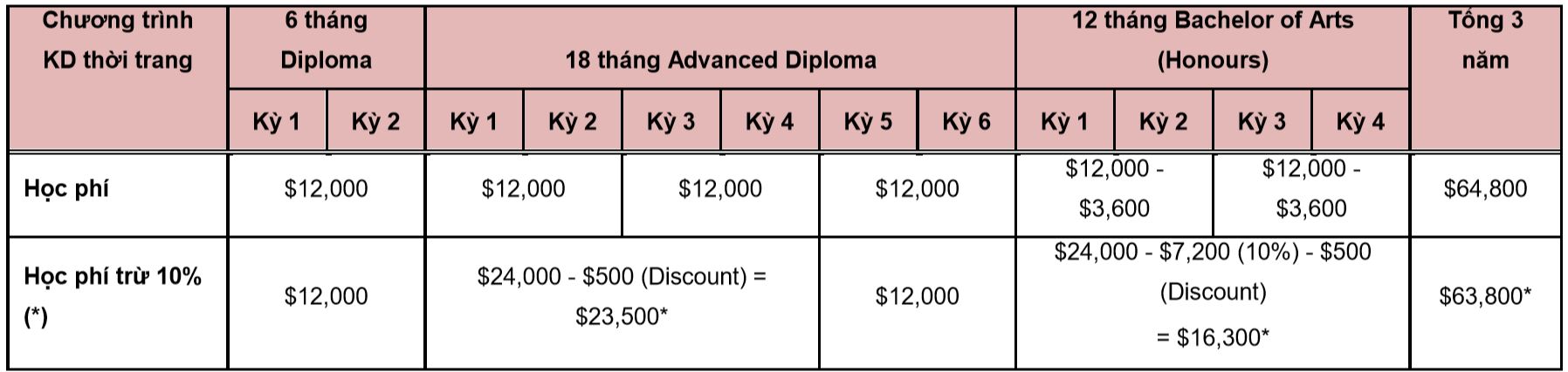 + Các sinh viên sẽ được giảm thêm SGD 2,000 cho cho các khóa Thiết Kế và SGD 1,000 cho khóa Kinh Doanh Thời Trang (cho cách đóng tiền hằng năm)